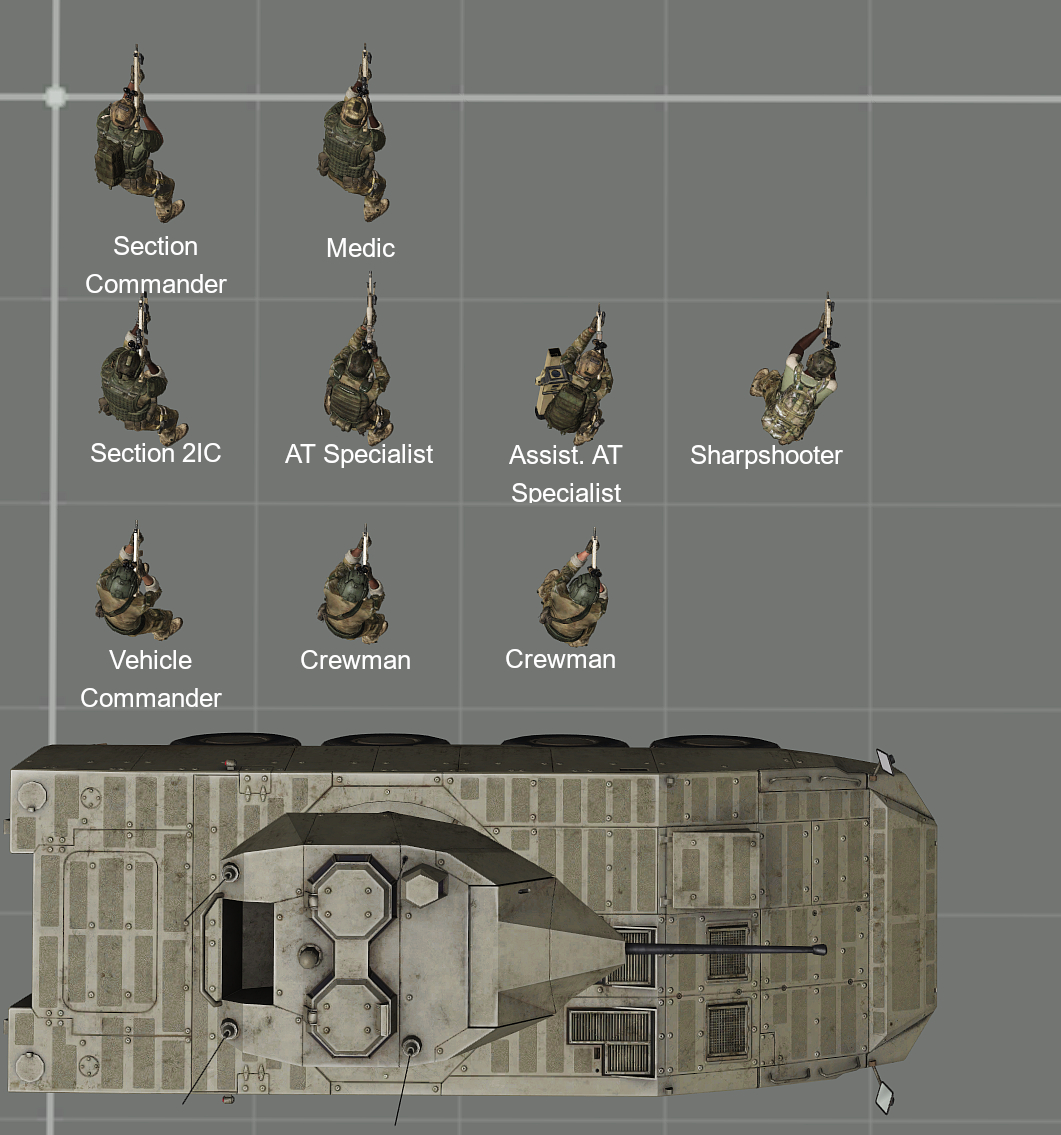 This is the largest supported section size. It has the highest level of combat-resilience available to all of the infantry sections. Due to it’s larger size, this layout is usually found in ground-heavy deployments, but can be used for air mobile assuming the available transport aircraft are big enough.