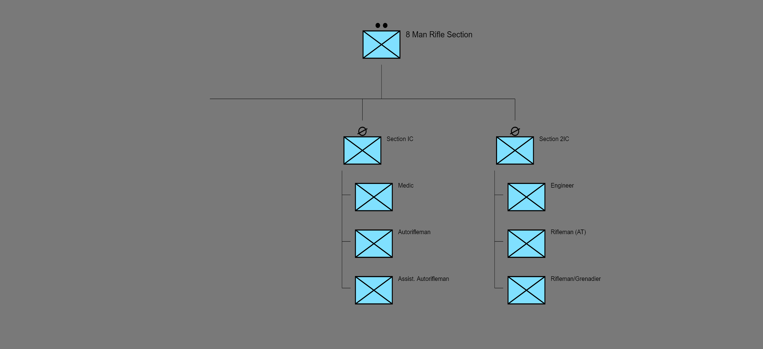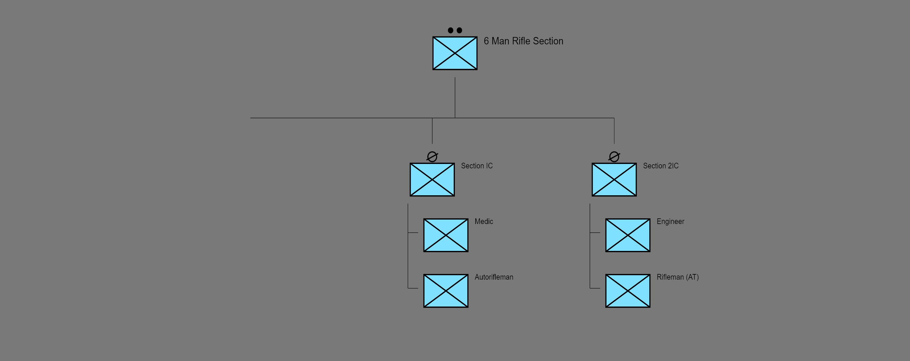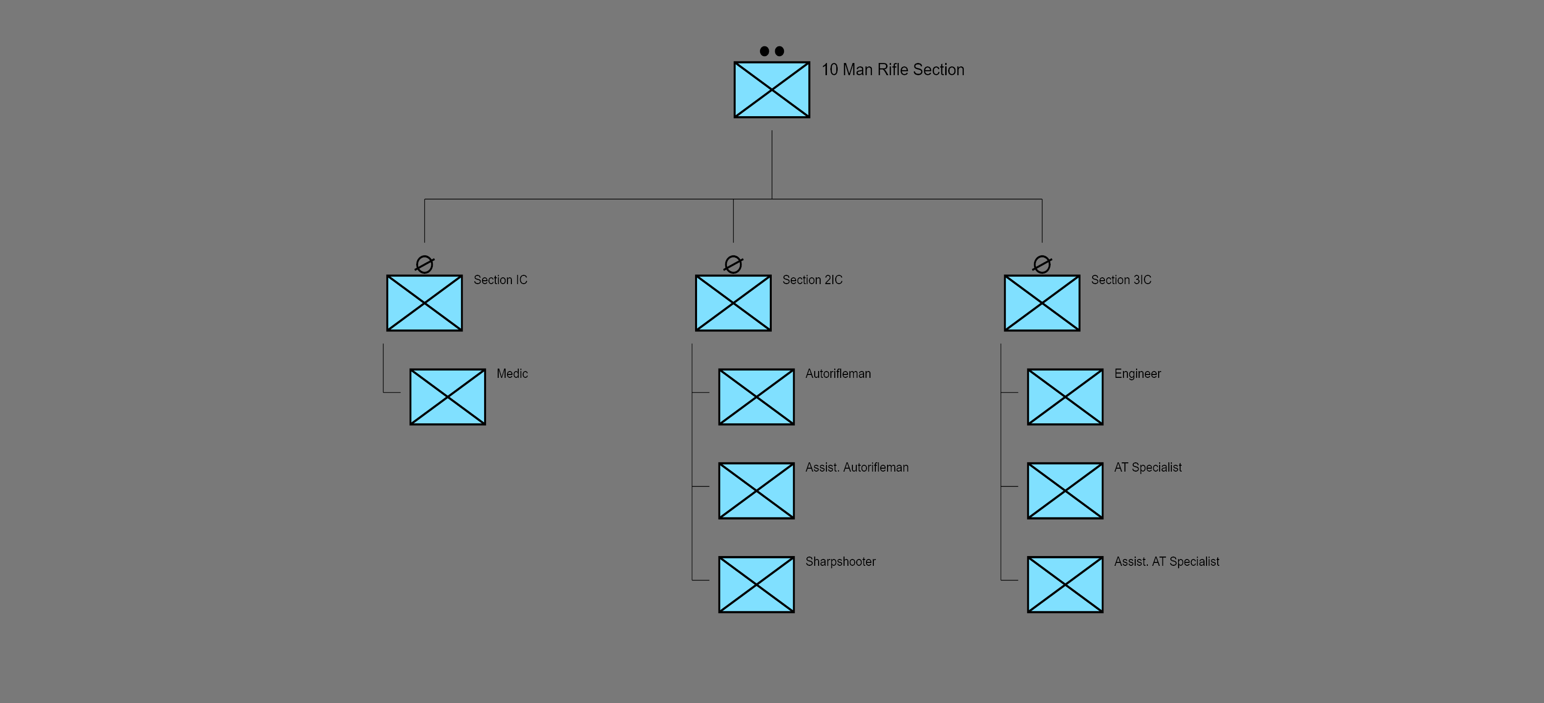 This is the largest supported section size. It has the highest level of combat-resilience available to all of the infantry sections. Due to it’s larger size, this layout is usually found in ground-heavy deployments, but can be used for air mobile assuming the available transport aircraft are big enough.