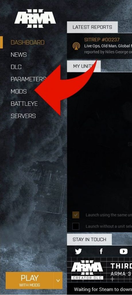 From the ArmA 3 launcher, locate the ‘Mods’ button on the left had side as illustrated below: